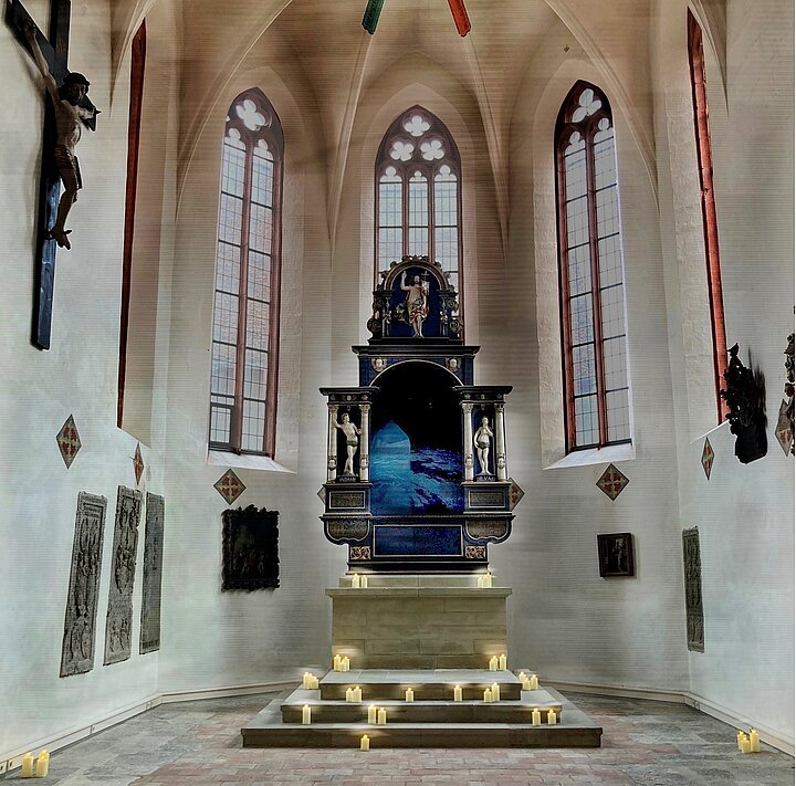Zum Auftakt des Formats "Kunst zur Passion" ist Künstlerin Meide Büdel in der Spitalkirche zu einem Künstlergespräch vor Ort, Dekanatskantorin Anne Barkowski begleitet die Veranstaltung mit dem Cello.